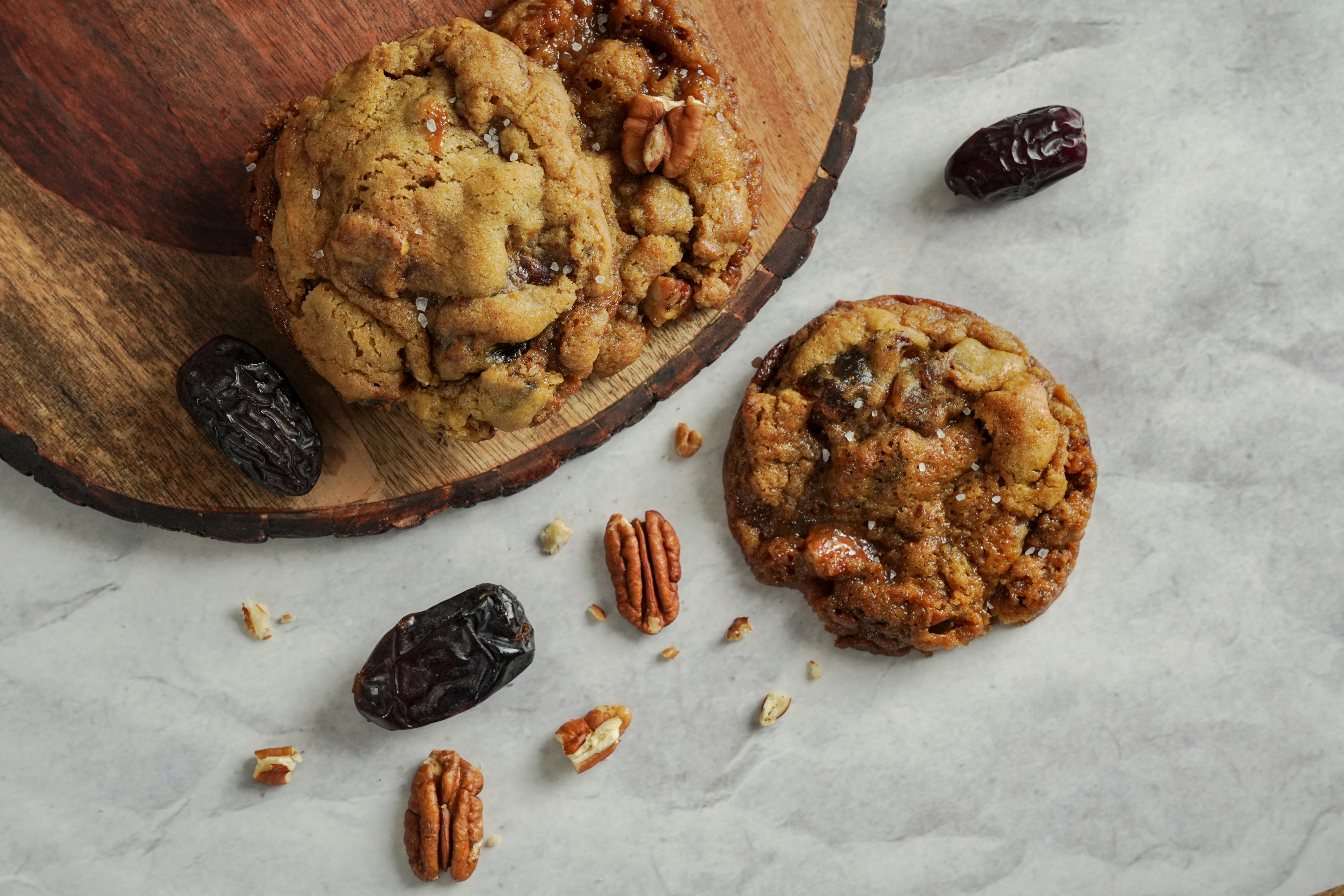 A delightful blend of rich, chewy dates with crunchy pecans and a hint of caramel in a buttery cookie base. Each bite delivers different textures and flavors: the natural sweetness of dates, the nutty richness of pecans, and the subtle caramel undertone that makes the cookies irresistible. The touch of caramel not only adds depth to the flavor but also elevates these cookies to a gourmet level. Dates bring a depth of sweetness that is both complex and satisfying. They are evenly distributed, providing bursts of sweetness in every bite. The pecans bring in a satisfying crunch and provides a nutty flavor.